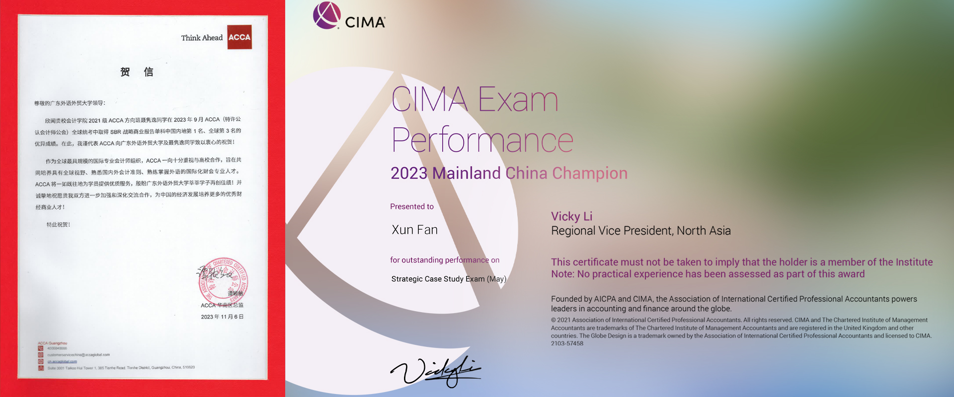 喜报!我院聂隽逸同学、樊汛同学在2023年ACCA CIMA考季中获中国内地单科第一